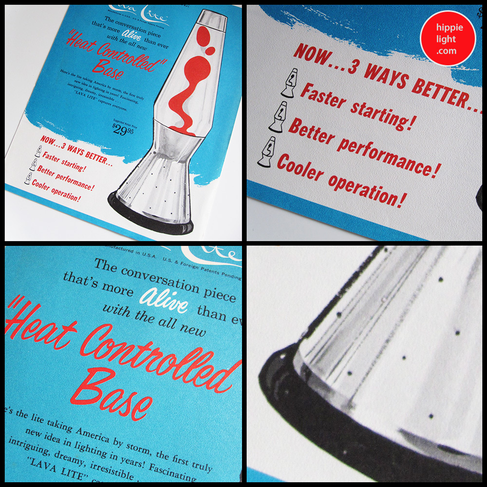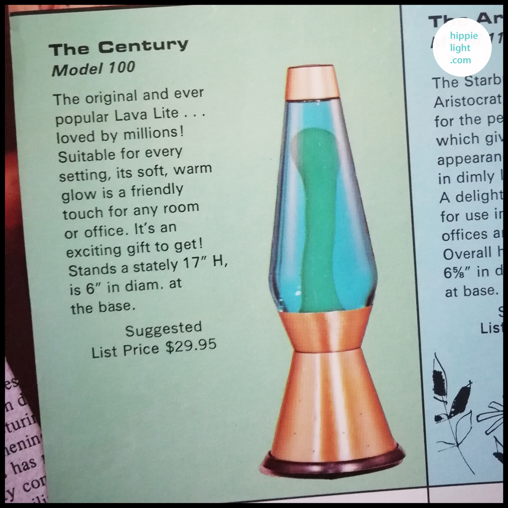 The Century was the first lava lamp produced in the USA and started the legacy of the "lava lamp" in the United States of America. The original founders of Lava Corp., were inspired by the Crestworth Astro Lamp, and they acquired the rights to sell it in the USA. They opened in Chicago and brought the magic of the Astro lamp to the USA in 1965. What would become the Century first appears refered to purely as "Lava Lite" in 1965 printed material and was described as "America's Most exclusive new look in lighting ... Adds glamour and interest to any setting!" The Century is the American version of the Astro with a few notable changes such as starlight holes in the base, which were very popular in lighting fixtures of the time. With its pinhole starlight base, it is a timeless design that will stand the test of time. The Century was a classic that was core to the lava lamp that was manufactured in Chicago in the USA. Century and all the great vintage USA lava lamps are the vision of Hyman Spector, the owner of Lava Corp. 1960s colour combinations for the Century include: Red/ Fluorescent Green, Orange/ Yellow, Green/ Blue, Yellow/ Green-Blue and Red/ Clear. The Century also featured a Champagne Mist colourway, that was refered to as "A cream base in a pale amber liquid - A truly enchanting combination" Century uses a 40 watt appliance bulb. Century made in the USA was an unusual exotic decorator conversation piece. Use a 40w bulb inside your vintage Century for the correct flow. Some of the very first colour combinations for the early models would be: Red / Fluorescent Green, Orange / Yellow, Green / Blue, Yellow / Blue Green, Blue / Lavender and Red / Clear. Power those early models with a 30 watt R-20 reflector bulb. The Century is one of the most enduring lava lamps of all time and at www.hippielight.com we love Model 105: "Champagne Mist - a cream base in a pale amber liquid, a truly enchanting combination!" |