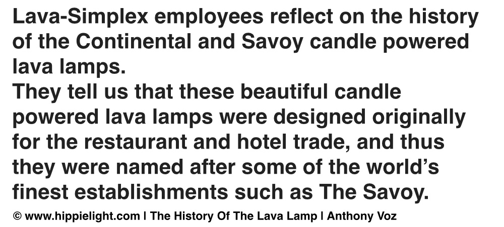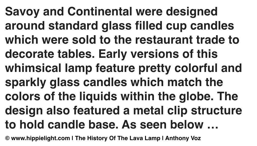 Merging candle light with the motion of the lava lamp, the Continental and the Savoy were the only vintage non-electric, candle powered lava lamps, with a special candle powered unit, that would power your light for 75 hours, for plenty of bubbling. Today these candle powered lava lamp units are no longer available so a raised tea-light often does the trick.
