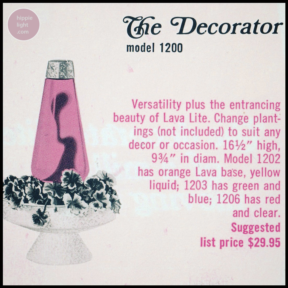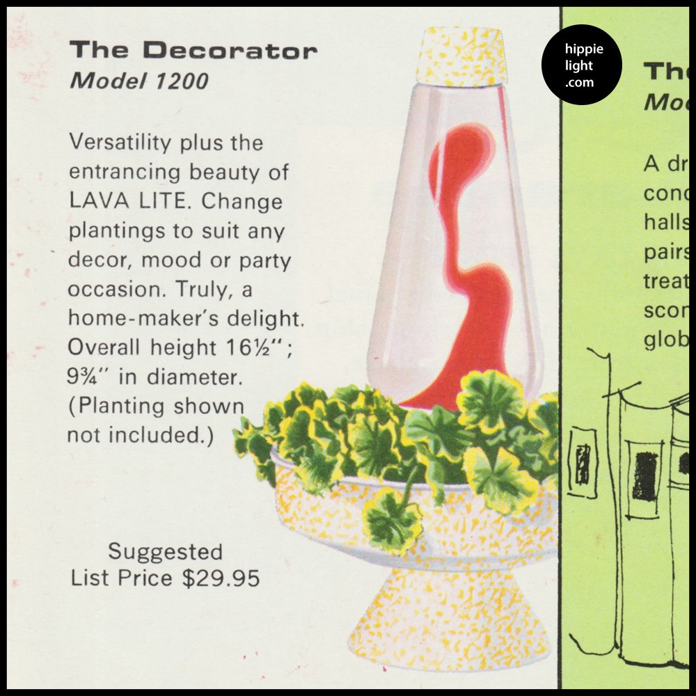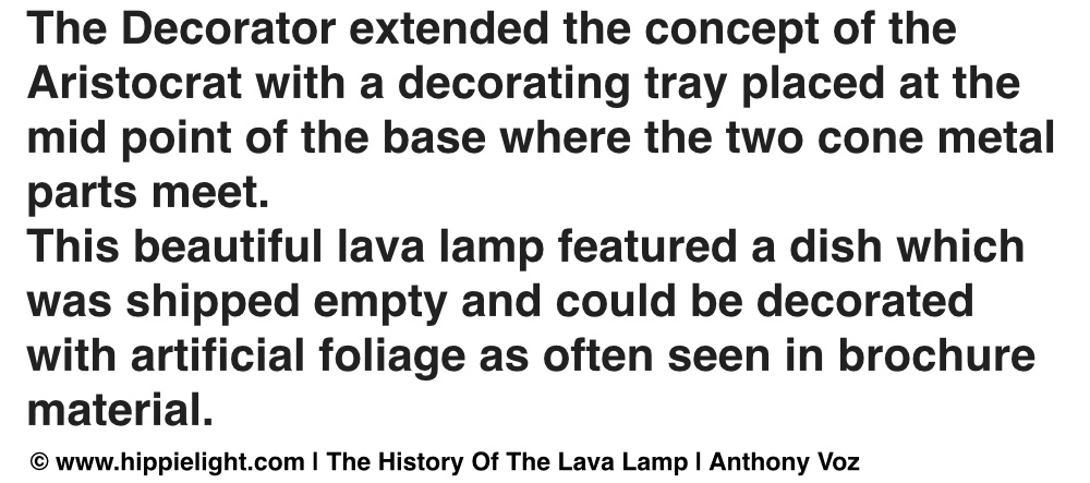 The Decorator extended the concept of the of the Aristocrat with a decorating tray placed at the mid point of the base where the two cone metal parts meet. This beautiful lava lamp featured a dish which was shipped empty and could be decorated with artificial foliage as often seen in brochure material. Decorator is most likely to be seen with the white porcelainized base with gold striations (gold paint splashed all over the base). This finish is often seen on other home items of the time. The big question is how will you decorate yours?