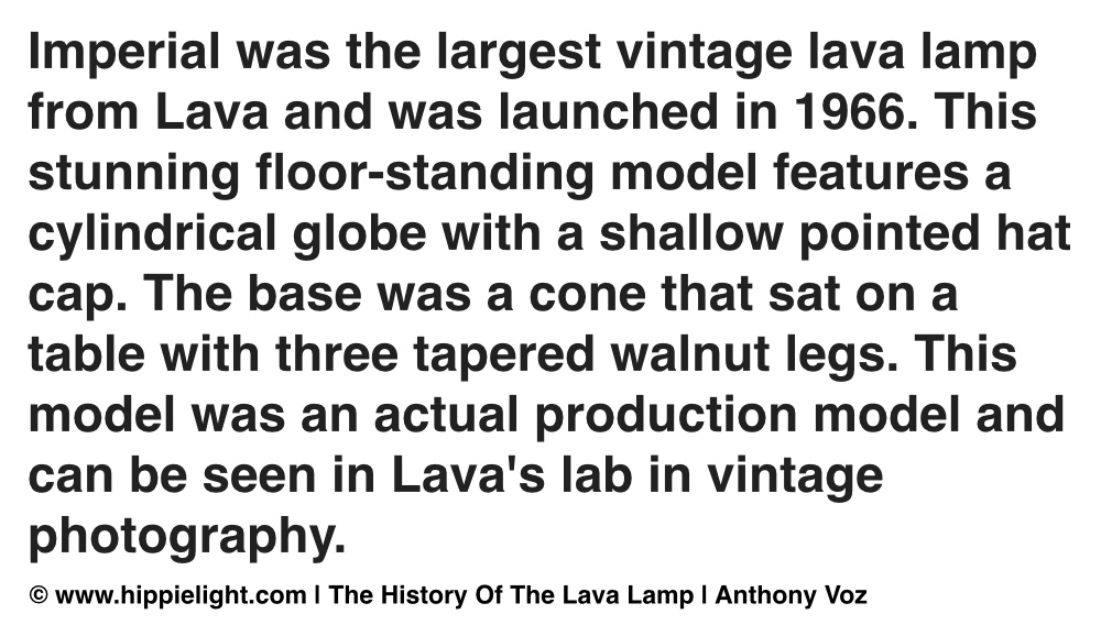 Imperial was the flag-ship lava lamp from Lava launched in the 1960s. This stunning floor-standing model features a cylindrical globe with a shallow pointed hat cap. The base was a cone cylinder that sat on on a table with three tapered walnut legs. Imagine this in a night club, hotel or any public space. Giant, beautiful and often confused with Crestworth's Princess floor-standing model, this model was an actual production model and can be seen in Lava's lab in vintage photography.