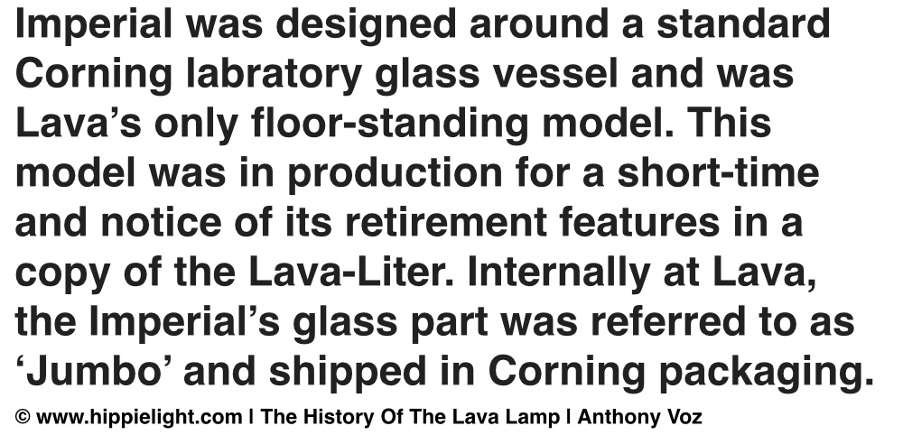 Simply King Size. Simply Dazzling. Simply Stunning. Simply The Imperial. One vintage Lava Lamp rules supreme, simply the largest ever vintage USA lava lamp, The Imperial was amazing. King-size elegance and beauty. The Imperial featured a massive container supported on a beautiful metal and walnut stand. These lamps were individually carton packed and the 1966 wholesale brochure shows 3 colour ways for the product. This model was sold for $149.50 and has been seen featured in a 1966 brochure. Very few of these stunning pieces have been seen and they a tribute the liquids within. Imperial featured a list price of $129.50