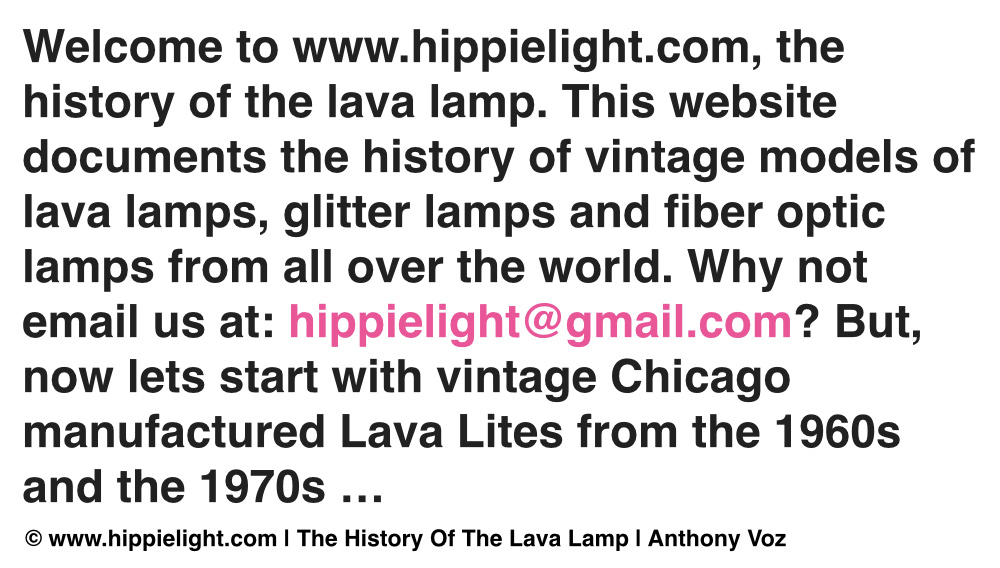 Hippielight.com has been dedicated since its very first day to the history of vintage "lava lamps" and the original vintage designs relating to the 1960s & 1970s. Hippielight documents the legacy of vintage "lava lamps" from all over the world, the vintage designs and the designs that are loved by everyone still today, decades after their release. From Century, to Enchantress Planter, to Carlisle, to Continental, to Decorator, to Aristocrat, these vintage manufactured "lava lamps" are still loved by thousands today and are represented here through photography and nostalgic memorabilia in collections and displayed on www.hippielight.com.