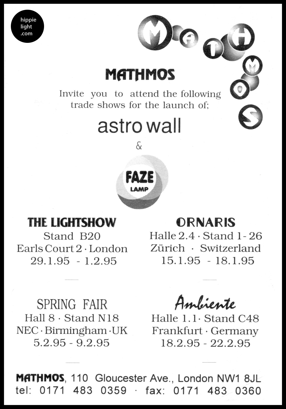 In the late 1980s, Cressida Granger & David Mulley approached Edward & Christine Craven Walker, to remarket the lava lamp to a new generation. The result was Mathmos. Lamps from the past returned with refreshed colour ways and replacing the copper anodic finish of the past with a more contemporary silver aluminium finish. Over the 1990s, the demand for the lava lamp grew and grew, these images below from different moments of time from the 1990s show the vibrance of Mathmos with products such as: Astro, Astro Baby, Jet, Telstar, Glitter Baby and Lunar ... |