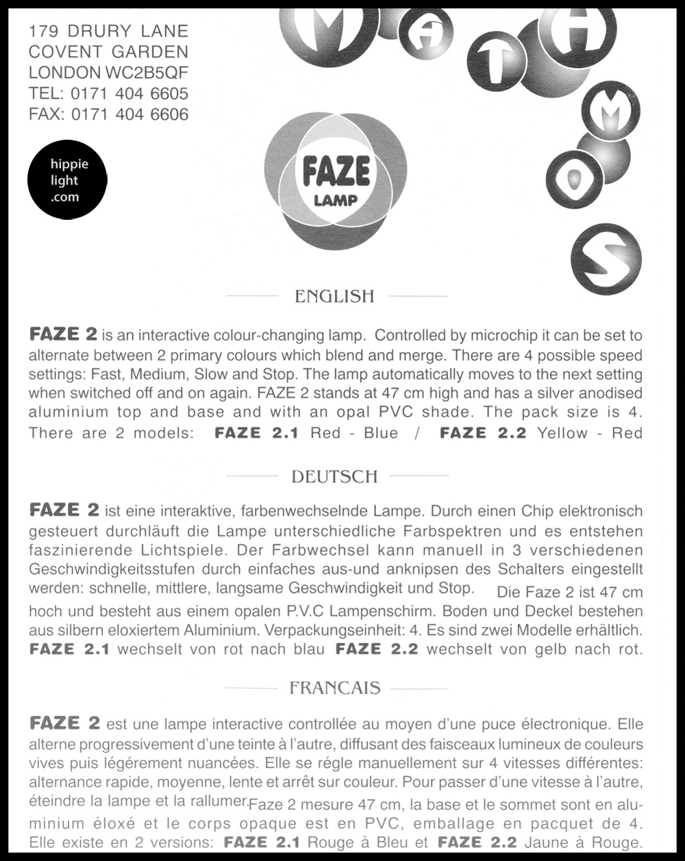 Mathmos produced a selection of fibre optic lamps over the 1990s such as the: Jupiter 2, Starburst and lastly the Fibre Space. Mathmos also produced a line of colour changing bulb powered lava lamps under the name Faze. Enjoy the images of the Fibre Space, Faze 2 (Tubular model below) Faze 3 (Pyramid model below) below ... |